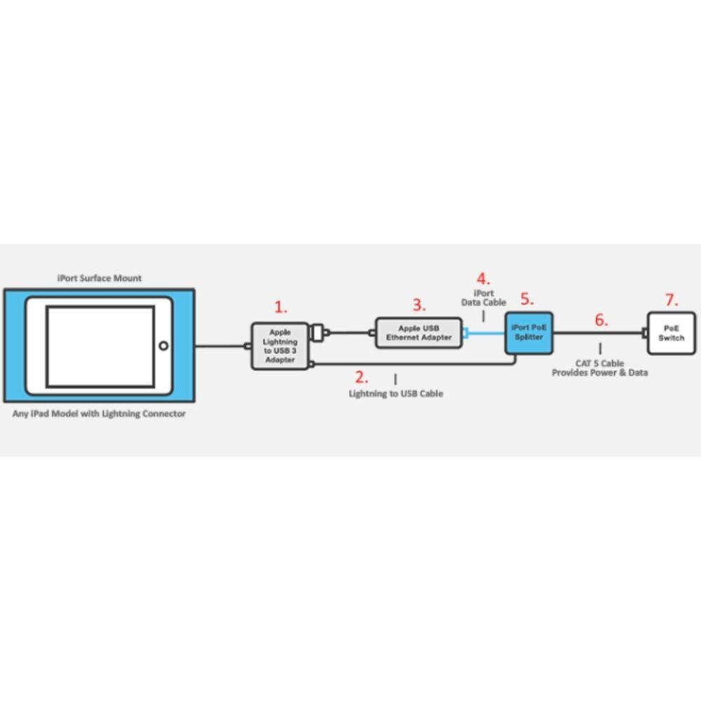 This data cable allows for only 1 CAT cable to be run to each location a surface mount is installed to provide power and data when paired with the iPort Splitter, Apple USB to Ethernet adapter and Apple Lightning to USB 3 adapters.